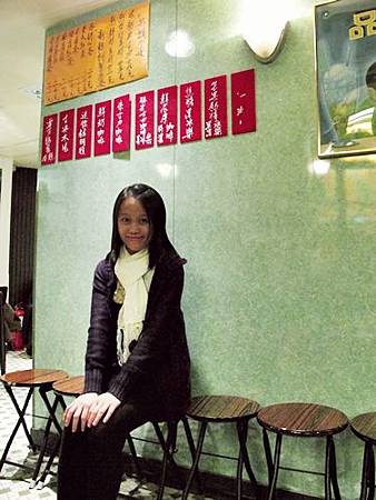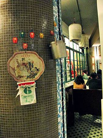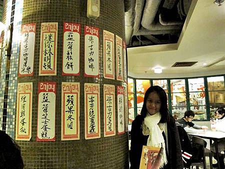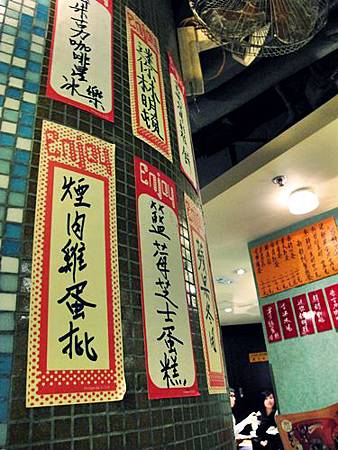 除了是靠窗的座位,頭上還有沒有鳥的鳥籠。背後更是一支貼滿中文餐單的柱子。