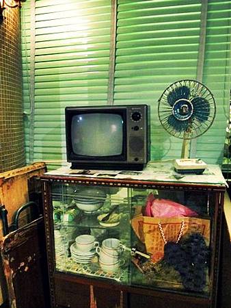 有個小角落還擺放了一個櫥櫃,上面有復古舊電視,風扇,碗碟杯子等。