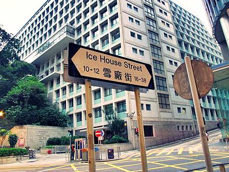 皇后大道中與雪廠街的岔口,香港置地文華東方酒店對面路斜坡上。